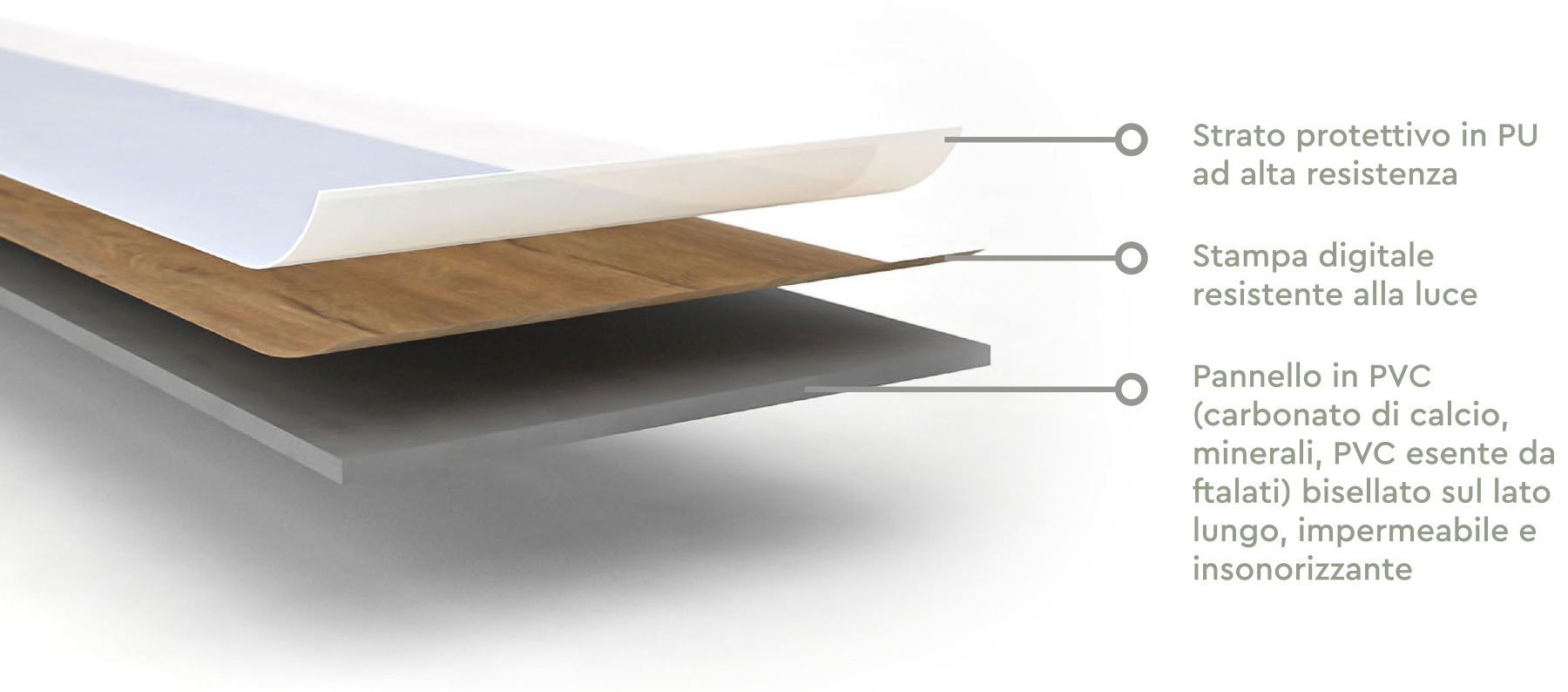 Il cuore del prodotto è un pannello rigido in PVC, privo di ftalati e arricchito con carbonato di calcio: un materiale compatto, insonorizzante e bisellato sul lato lungo per una posa impeccabile e senza fughe.